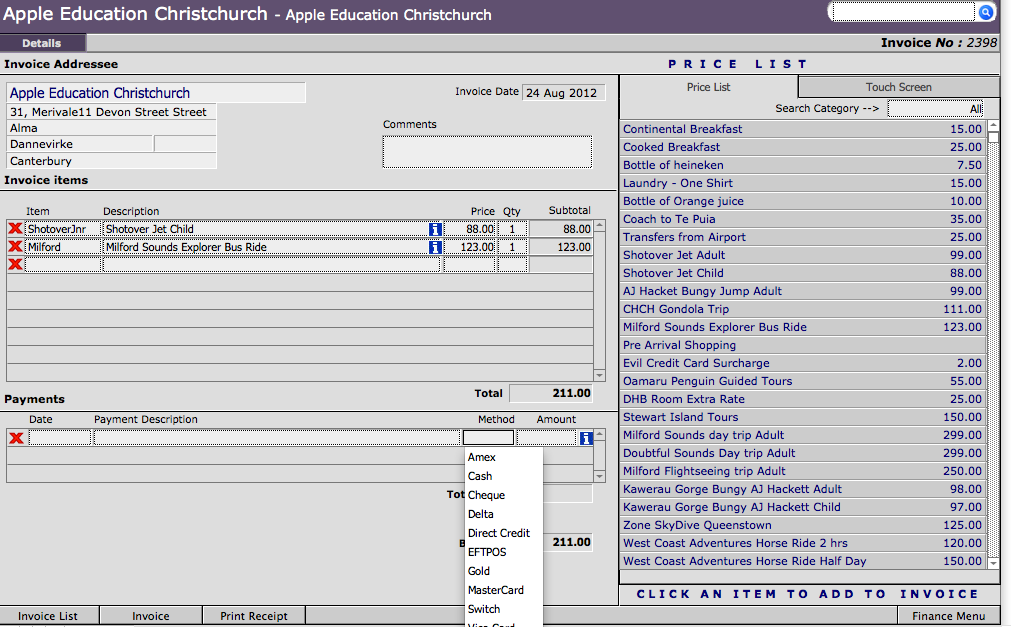 3. After confirming the message you will be taken to a screen whereby you can add line items to an invoice either manually (by keying directlyinto the first empty line under Invoice Items) or by selecting from your price list on the right hand side. You can also pay the the invoice from this page. To bring up the actual invoice click the Invoice button along the bottom of the screen